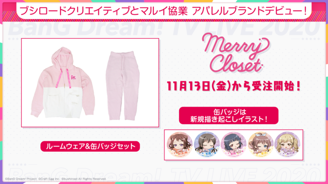 株式会社ブシロード(本社:東京都中野区 代表取締役社長:橋本義賢、以下、ブシロード)は、11月5日(木)に配信いたしました「バンドリ!TV LIVE 2020」第40回放送内にて、「Merry Closet」のガルパコラボ商品情報を発表したことをご報告いたします。また11月12日(木)22:00より配信いたします「バンドリ!TV LIVE 2020」第41回放送についてお知らせいたします。