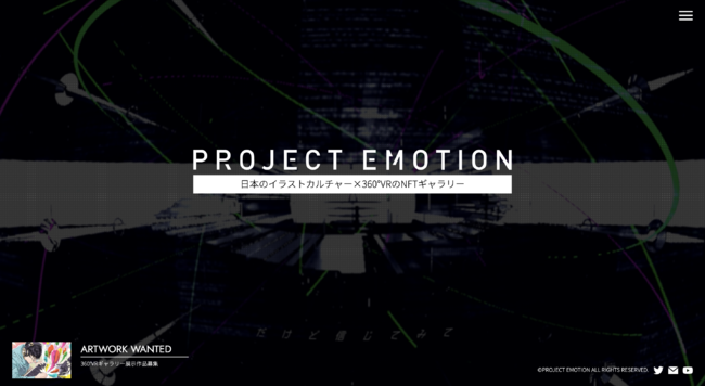 株式会社NOKID(本社:東京都八王子市、代表取締役 浜村 涼輔)は『日本のイラストカルチャー』をNFTによって盛り上げるため、NFTマーケットプレイスのOpenSea上でNFT化された作品を360°VRギャラリー内に展示する「PROJECT EMOTION(プロジェクトエモーション)」を2021年5月1日より開催します。Live配信される360°VRギャラリーの中から発見した作品は公式サイト(https://project-emotion.com/)で作品コードを入力するとOpenSeaにてオークション形式で購入が可能です。