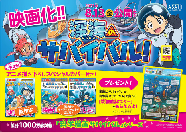 2021年8月13日(金)に公開が予定されている映画『深海のサバイバル!』の原作は、累計1100万部を突破した「科学漫画サバイバル」シリーズの中で最も累計発行部数が多い学習漫画となります。今回映画化を記念して、描きおろしのアニメスペシャルカバーとなって書店に並びます。本カバーは、映画のビジュアルとは少し違うオリジナルイラストとなります。(※最後に掲載されている映画ビジュアルのピピの表情との差にご注目ください)