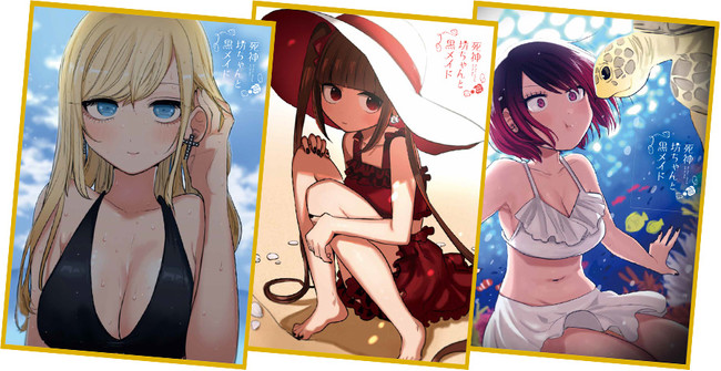 フェアの対象書店では、「死神坊ちゃんと黒メイド」の単行本を購入した人に、1冊につき1枚、イノウエ先生の描き下ろしイラストを使用した「ミニ色紙」をプレゼント。「ミニ色紙」の絵柄は全部で3種類。それぞれ「アリス」「ヴィオラ」「カフ」の水着姿が描かれています。「ミニ色紙」の裏面にはQRコードが掲載されており、このQRコードを読み込むと、坊ちゃん役の花江夏樹さんやアリス役の真野あゆみさんなど、アニメキャストが出演するオリジナルのボイスドラマを聴くことが出来ます。特典はなくなり次第終了となるほか、配布方法は書店により異なるため、詳細は書店店頭にてご確認ください。なお、キャンペーンの参加書店リストは週刊少年サンデーの公式サイトに掲載中です。