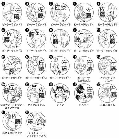 「ピーターラビット™もちものスタンプ」で選べるイラストはこちらの22種類。いたずら好きなピーターや従兄のベンジャミン、こねこのトム、あひるのジマイマ、かえるのジェレミー・フィッシャーどんなど、誰もが一度は見たことのあるおなじみのキャラクターを、ポンと押すだけで自分の持ちもののマークにすることができます。