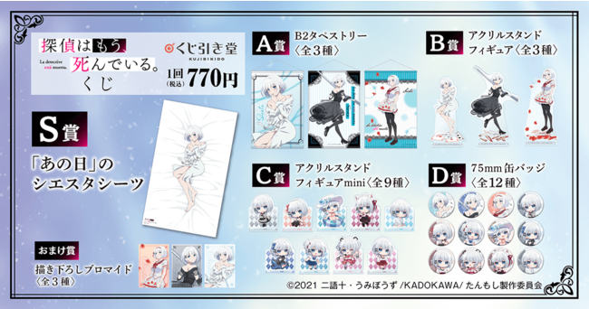 株式会社KADOKAWA(本社:東京都千代田区、代表取締役社長:夏野 剛 以下KADOKAWA)は、運営するオンラインくじサービス「くじ引き堂」において、TVアニメ『探偵はもう、死んでいる。』オリジナル商品が手に入る「探偵はもう、死んでいる。くじ シエスタコレクション」を、2021年8月19日(木)12時(正午)より販売いたします。
