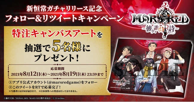 株式会社ディ・テクノ(本社:東京都中央区 代表取締役社長:市原 高明)は、スマートフォン向けゲームアプリ『MARS RED~彼ハ誰時ノ詩~(マーズレッド かわたれどきのうた)』の新恒常ガチャリリース記念として、特注キャンバスアートが当たるTwitterフォロー&リツイートキャンペーンを開始したことをご案内いたします。