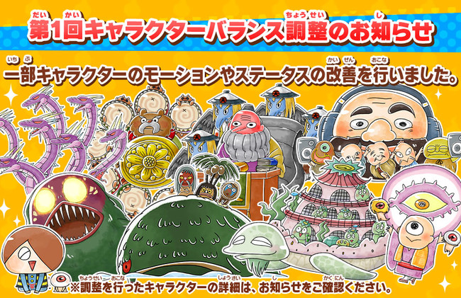 バランス調整の一例として、ゆるゲゲの初期から実装されていた「あたっか~」キャラクターの「ヤマタノオロチ」は、『体力の上昇』・『出撃待ちの短縮』・『ノックバック数の減少』・『攻撃間隔の大幅縮小』といったステータスの調整が入ります。