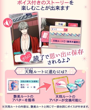 ボイス付きルート(天翔ルート)は、読み終えるとアプリ内の「思い出」に保存され、いつでもお楽しみいただけるようになります。