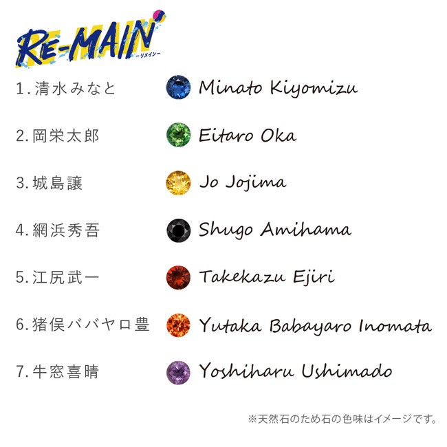 大人のための本格的なキャラクタージュエリーを扱うユートレジャー(東京都豊島区:代表取締役:伊藤 崇史)は、TVアニメ「RE-MAIN」とコラボし、新作リング(指輪)7種類を9月22日(水)~10月14日(木)の期間に予約受付を行ないます。このたびの新作は、リング(指輪)の表面に、水面の光の反射を細かな面で表現し、カラーストーン(天然石)を留めたデザインです。山南高校水球部の7人、清水みなと、岡栄太郎、城島譲、網浜秀吾、江尻武一、猪俣ババヤロ豊、牛窓喜晴をそれぞれイメージしたカラーストーン(天然石)から、お好みのキャラクターを選び、さらに、内側にはそのキャラクターの名前を刻みます。ユートレジャー コンセプトストア池袋、ユートレジャーオンラインショップで初めて取り扱うライセンスとなります。