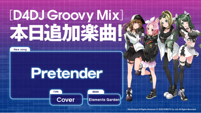 株式会社ブシロード(本社:東京都中野区、代表取締役社長:橋本義賢、以下ブシロード)は、株式会社DONUTS(本社:東京都渋谷区、代表取締役:西村啓成)と共同開発のスマートフォン向けリズムゲーム「D4DJ Groovy Mix」(以下グルミク)に、カバー楽曲「Pretender」を追加いたしました。報道関係の皆様におかれましては、ぜひ本情報をお取り扱いいただけますよう、お願い申し上げます。