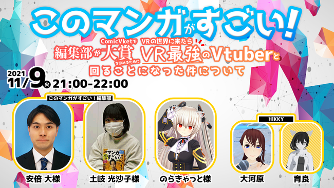 株式会社HIKKY(本社:東京都渋谷区、代表取締役:舟越靖)が2021年11月6日(土)から11月14日(日)の9日間で開催するバーチャル空間での同人誌即売会「ComicVket 2」(読み:コミックブイケット ツー)にて、宝島社『このマンガがすごい!』の編集部員の方々と出展作品を見て巡り、“このマンガがすごい!編集部によるComicVket大賞”を決定する公式配信イベントを11月9日(火)の21時〜22時で開催いたします。