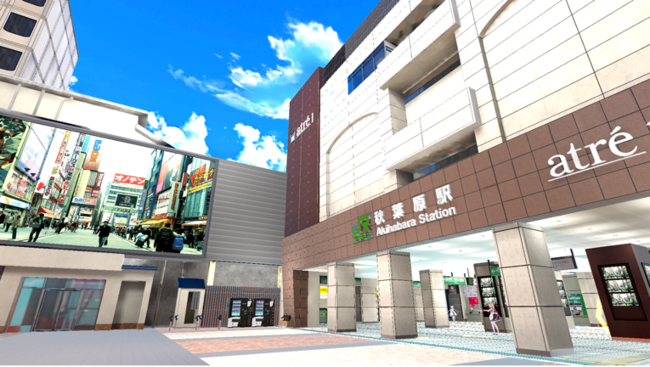 今回のComicVketの会場は秋葉原の街をリアルに再現しつつバーチャルならではの要素も盛り込んだ「バーチャル秋葉原」。会場のスタート地点は、JR東日本完全協力で制作された『バーチャル秋葉原駅』です。バーチャル秋葉原駅の改札を出た地点から始まり、改札を出て右手に進むと、バーチャルの秋葉原電気街が広がります。