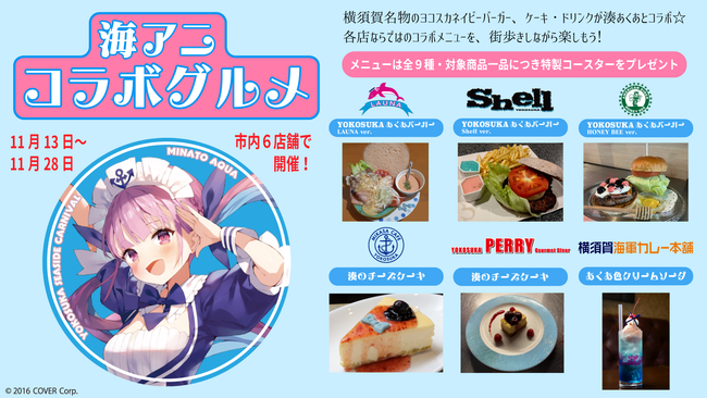 横須賀名物のヨコスカネイビーバーガー、ケーキ・ドリンクが、イベントアンバサダーの湊あくあとコラボします。 横須賀自慢の店ならではの工夫を凝らしたコラボメニューを、街歩きをしながらぜひご堪能ください。