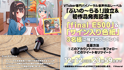 VTuber専門バイノーラル音声作品レーベル「ぶいの~らる!」の設立と第1弾発売を記念し、フォロー&RTキャンペーンを開催!