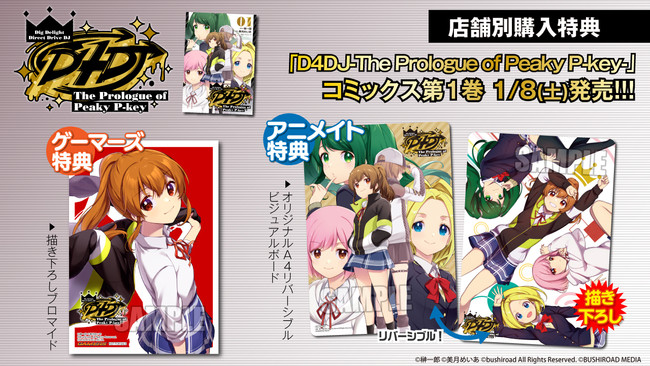 株式会社ブシロード(本社:東京都中野区、代表取締役社⻑:橋本義賢、以下ブシロード)のグループ会社にあたる株式会社ブシロードメディア(本社:東京都中野区、代表取締役社長:成田耕祐)は、アプリ「マンガドア」にて好評連載中の『D4DJ-The Prologue of Peaky P-key-①』が明日1月8日(土)に発売することをご案内致します。ブシロードによる「DJ」をテーマにしたメディアミックスプロジェクト「D4DJ」に登場する、不動の人気を誇る高校生ユニット「Peaky P-key」誕生秘話を描いた本作品はファン必見の一冊となっております。皆様におかれましては是非誌面・Web記事等で本内容をお取り扱いいただければ幸いに存じます。