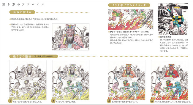 書中収録原画「閻魔大王」を参考に、基本の塗り方、塗り方の過程、より上手に塗るテクニックなど、