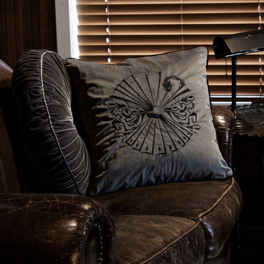 異能力「人間失格」、「スカーフ」等をイメージした刺繍をあしらったクッションカバー。ほど良い起毛感と微光沢な素材感が、お部屋をプチグレードアップしてくれます。裏側の織ネームもポイントです。