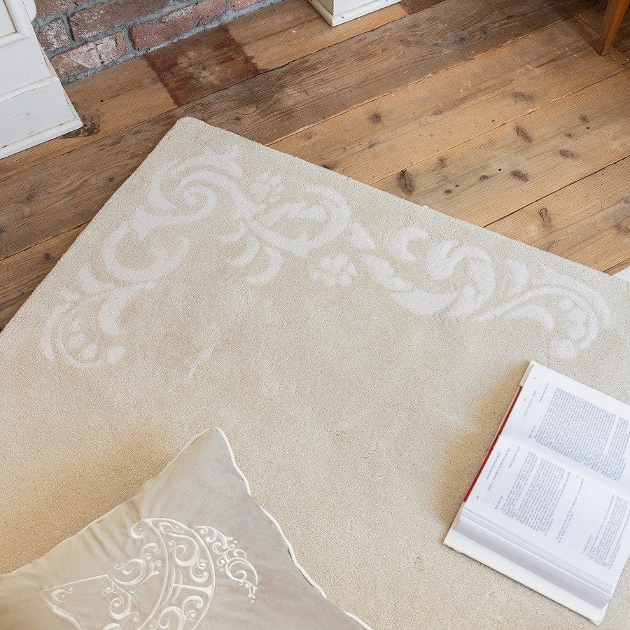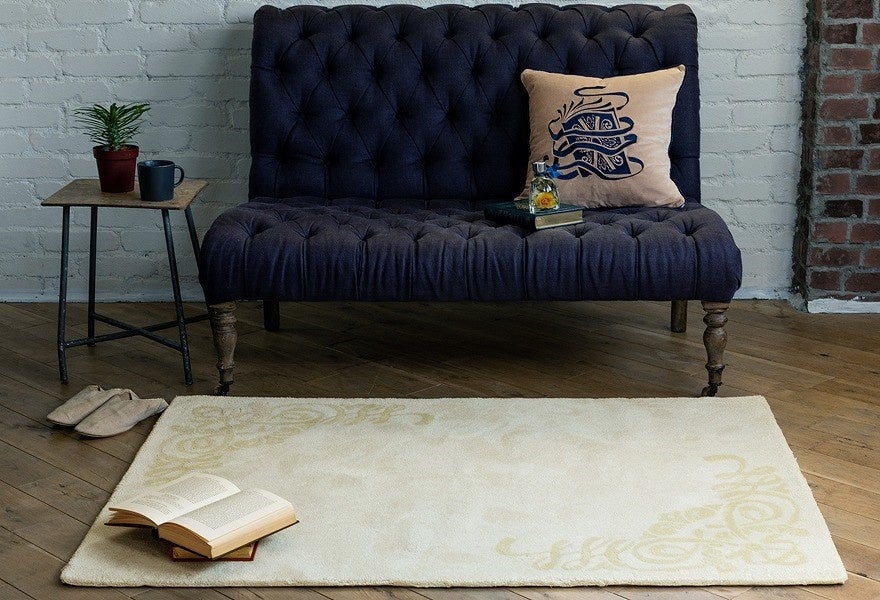 アラベスク調の模様に、中島敦の異能力「月下獣」等をイメージし、手やしっぽなどのモチーフを散りばめた、UULオリジナルテキスタイルのラグマット。落ち着きのある色みと、毛足のあるリッチな感触で、高級感のある仕上がりです。