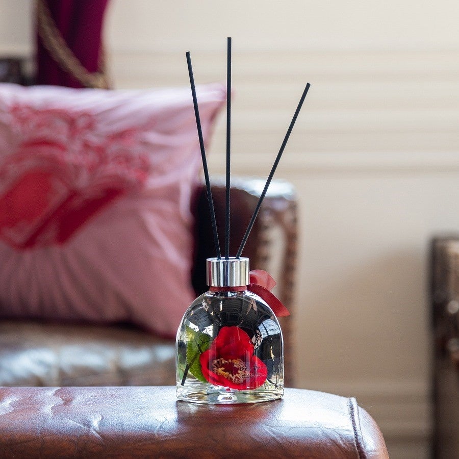 ポートマフィアの幹部である、好戦的な中原中也を表現したアロマリウム。中也らしいスパイシーでニヒルな香りに少し苦みのあるウッディ調の硬質な香りを合わせました。ボトルの中のツバキと、ほのかに混じったワインの香りがポイントです。