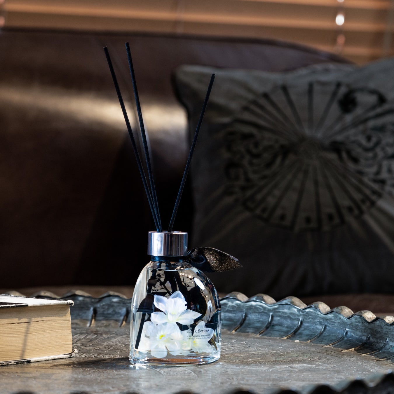 ミステリアスでどこか影のある、太宰治を表現したアロマリウム。重厚で暗いトーンのジャスミンに太宰をイメージしたお香のように香るスモーキーなアンバーで仕上げました。ボトルの中の黄色いバラがポイント。お部屋の一角に飾ればラグジュアリーな空間に!