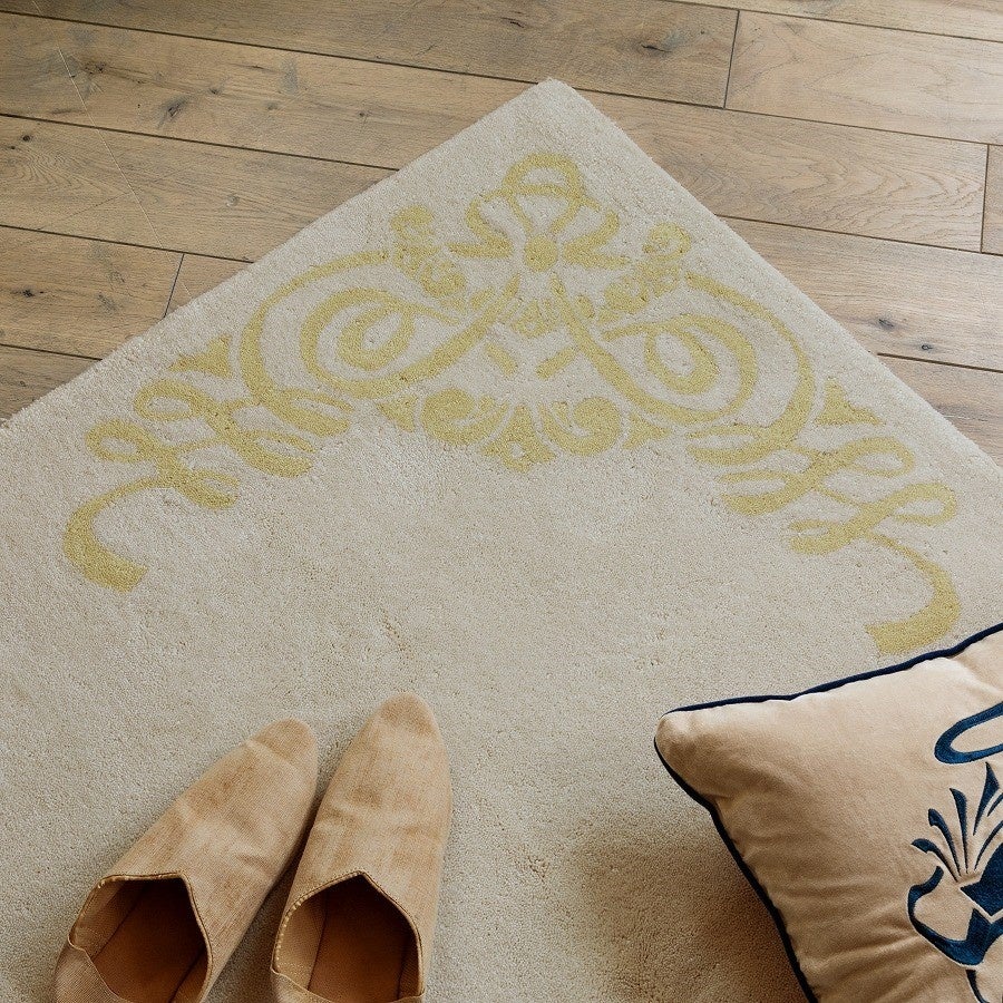 アラベスク調の模様に、中島敦の異能力「月下獣」等をイメージし、手やしっぽなどのモチーフを散りばめた、UULオリジナルテキスタイルのラグマット。落ち着きのある色みと、毛足のあるリッチな感触で、高級感のある仕上がりです。