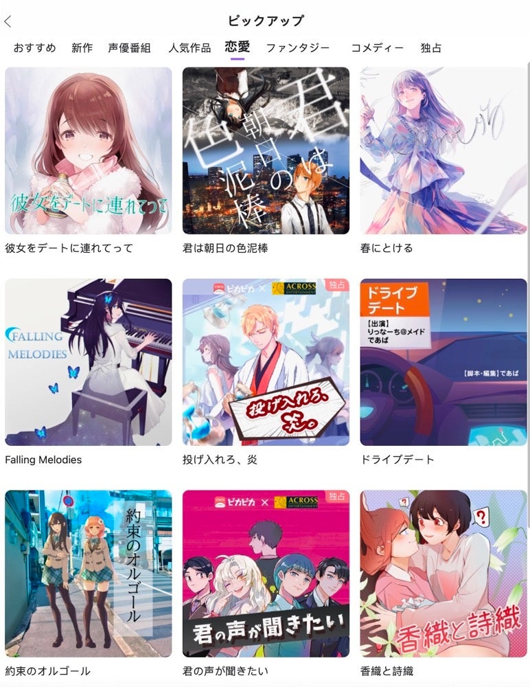 恋愛、ファンタジー、コメディー等多種多様な作品があり、今後さらに豊富な作品を掲載予定です。声優、声劇愛好者、クリエイターが活動しやすい場所を見つけ、素敵な作品をここで発掘することによって、既にピカピカで活躍中のライバーの方でも「声劇」で魅力的なもう一面をリスナーに見せる事ができます。