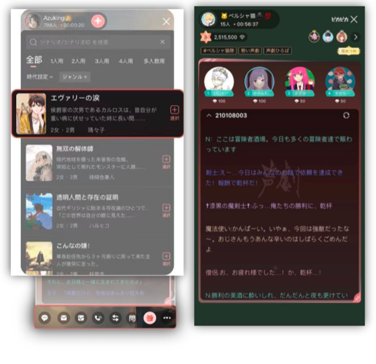 ボイスドラマを視聴するだけでなく、視聴者がボイスドラマの生配信を体験できるのは「声劇」機能になります。オリジナルシナリオを含め、ピカピカ内に掲載されているボイスドラマシナリオを使い、一般の視聴者が生配信に挑戦して声の演技をすることができます。