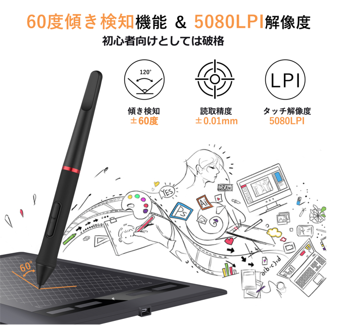 ・±60°傾き検知レベルと8192段階の筆圧感度