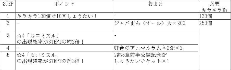 本しょうたいは回数制限なしの5STEPしょうたいで、STEP3とSTEP5では☆4「カコミスル」の出現確率がアップします。