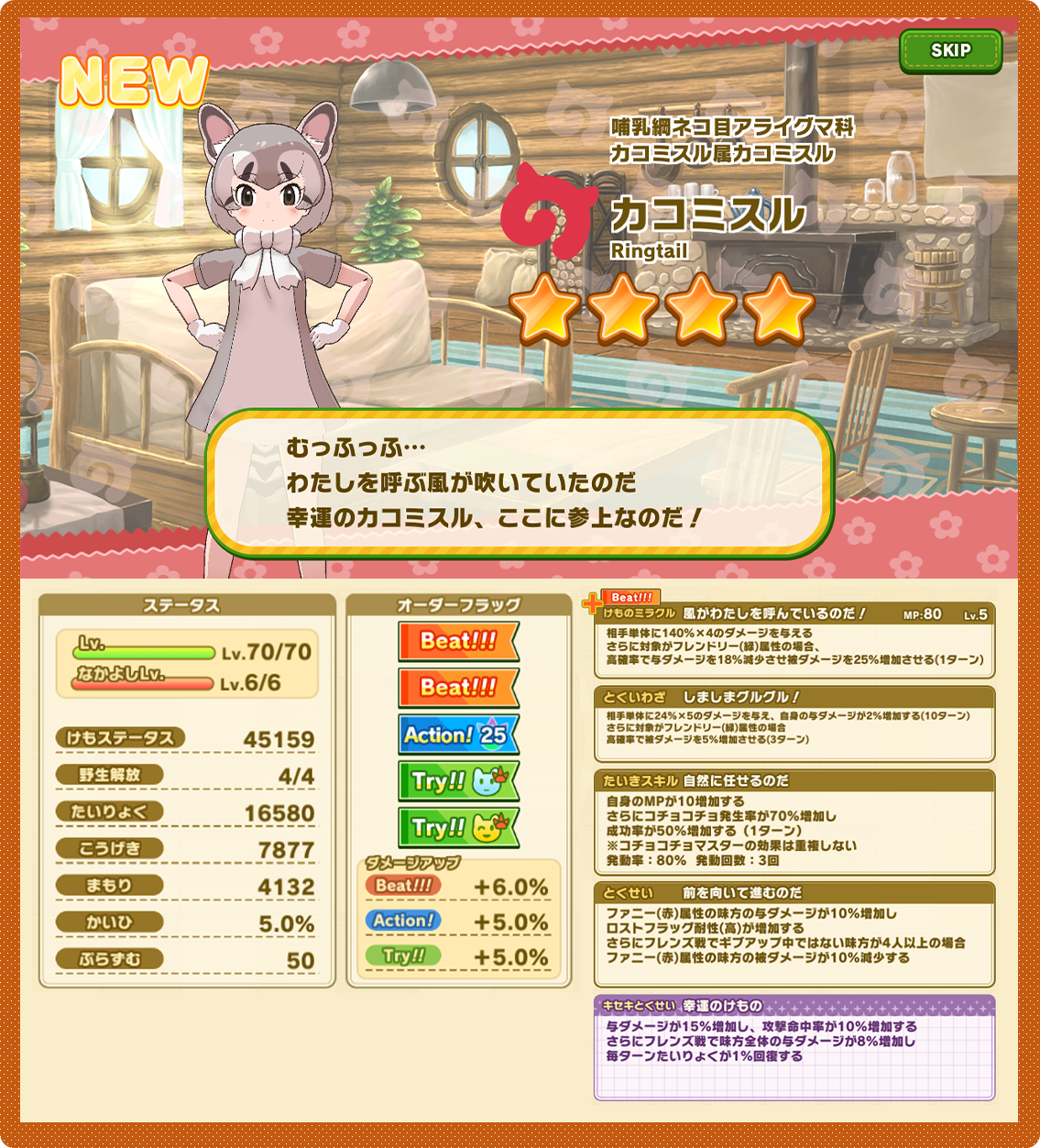※表示されているステータスは「Lv.」「なかよしLv.」「野生解放」「けものミラクル」「フォトポケ」が強化された状態です。入手時はLv.1および未強化の状態になります。