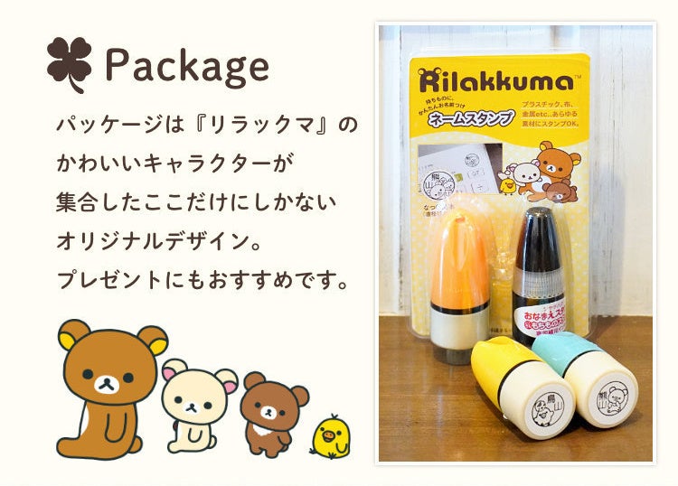 「リラックマ もちものスタンプ」は、布やプラスチックなどあらゆる素材にスタンプOK。耐水性インクを使っているため、洗濯や洗い物にも落ちにくいのが特徴です。