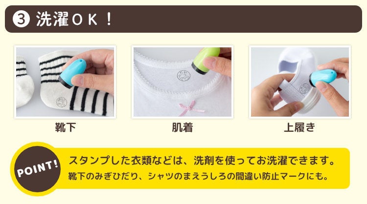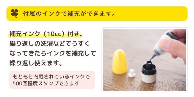 「リラックマ もちものスタンプ」は、布やプラスチックなどあらゆる素材にスタンプOK。耐水性インクを使っているため、洗濯や洗い物にも落ちにくいのが特徴です。