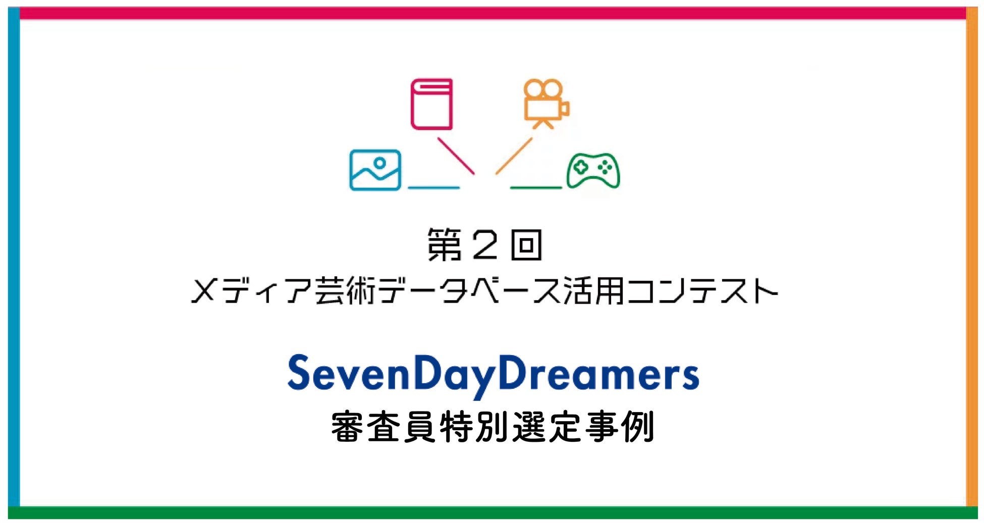 株式会社SevenDayDreamers(東京都葛飾区、代表取締役 湯通堂圭祐)は、文化庁が主催する「第2回メディア芸術データベース活用コンテスト」において、審査員特別選定事例に選ばれました。