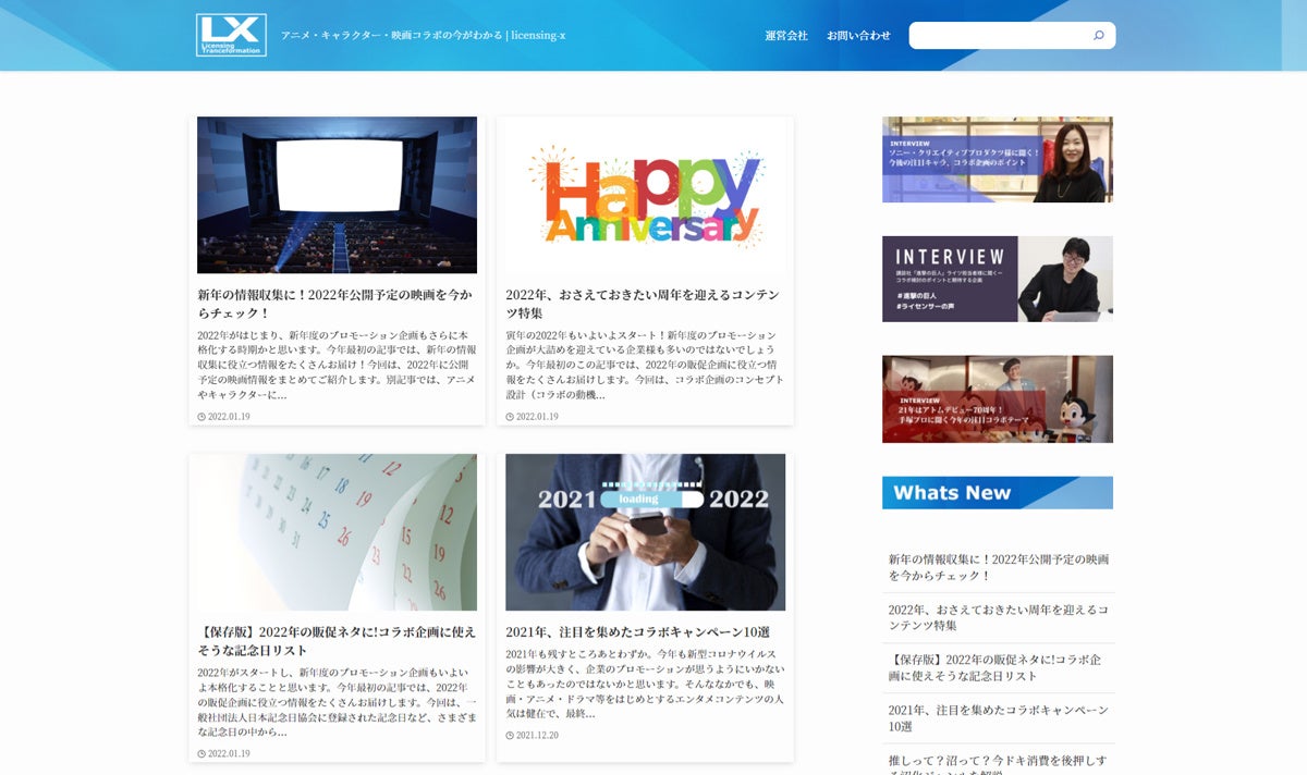 今回、そのスタッフブログを全面リニューアルし、「ライセンシング・トランス(LX)」と名前を変えて正式リリースすることにいたしました。「LX」では、今注目の“推し活”を徹底的に分析しているほか、エンタメコラボにかかる費用やノウハウの一部を公開するハウツー記事、版権を取り扱う出版社や映画配給会社の担当者に話を聞くインタビューなどの記事を掲載していきます。