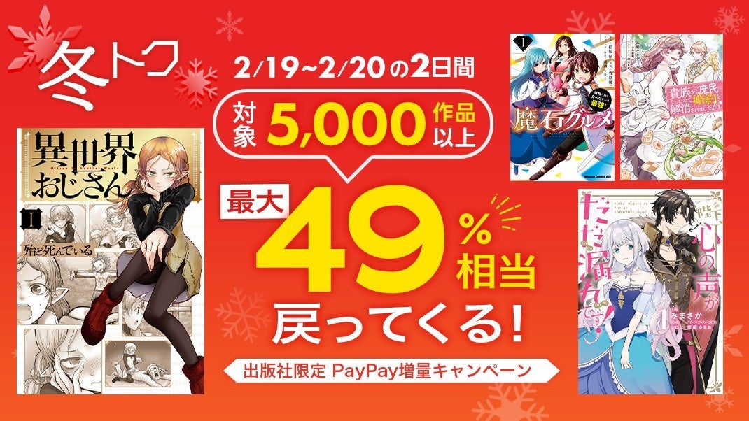 電子書籍販売サイト「ebookjapan」をヤフー株式会社と協力して運営する、株式会社イーブックイニシアティブジャパン(本社:東京都千代田区、代表取締役社長:高橋将峰(たかはしまさみね))は、ebookjapanでPayPay連携すると、誰でも決済金額に対して49%相当のPayPayボーナスを付与する出版社限定PayPay増量キャンペーン「冬トク」を、2022年2月19日(土)~2022年2月20日(日)の2日間実施します。対象作品は実写映画化も決定している『メタモルフォーゼの縁側』や話題の異世界マンガ『異世界チート魔術師』など含めた5,000作品以上。このお得な機会に是非お買い求めください。