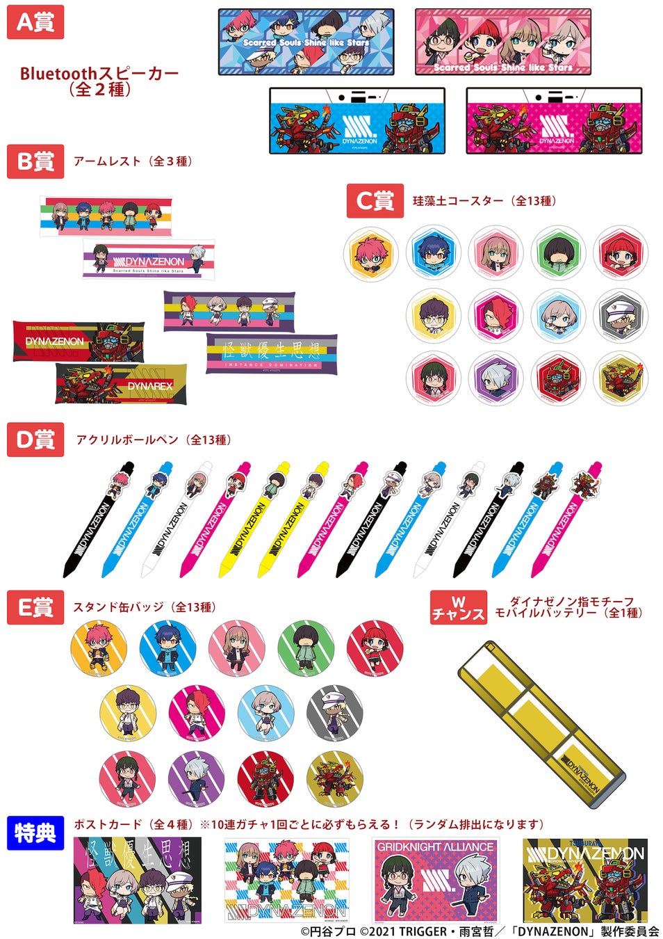 オンラインくじサービスである『ガチャトク』にて、2022年2月20日正午より、TVアニメ『SSSS.DYNAZENON』をスタートいたしました。TRIGGER作品でお馴染みのイラストレーター“まご”さんによるミニキャラを使用したオリジナルデザイングッズで、A賞「Bluetoothスピーカー」(全2種)、B賞「アームレストミニクッション」(全3種)、C賞「珪藻土コースター」(全13種)他、1回のくじごとに当たるチャンスがあるWチャンス賞には“ダイナゼノン指モチーフ“「モバイルバッテリー」を限定5名様に。A賞〜Wチャンス賞まで、キャラクターの魅力いっぱいのラインナップで展開いたします。