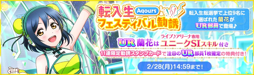 ・UR蘭花は「転入生フェスティバル勧誘〜μ’s〜」および「転入生フェスティバル勧誘〜Aqours〜」の終了後、3/5 16:00以降のμ’s特待生勧誘と3/20 16:00以降のAqours特待生勧誘から排出されます。