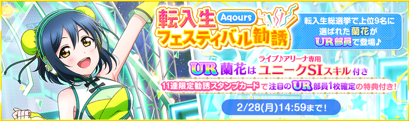 ・UR蘭花は「転入生フェスティバル勧誘〜μ’s〜」および「転入生フェスティバル勧誘〜Aqours〜」の終了後、3/5 16:00以降のμ’s特待生勧誘と3/20 16:00以降のAqours特待生勧誘から排出されます。