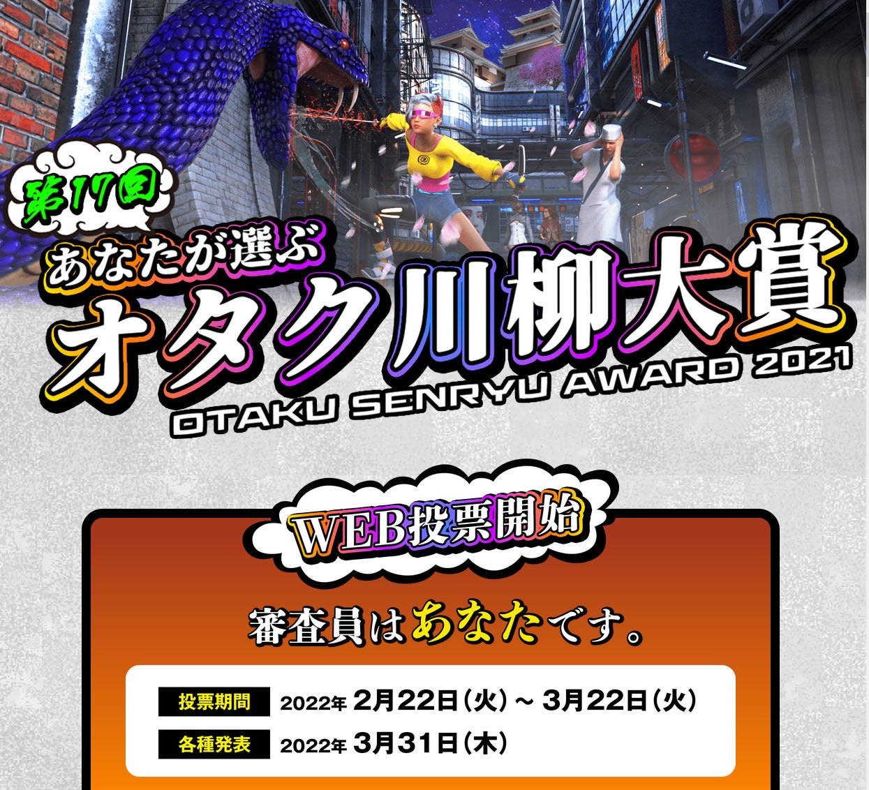 オタク川柳はオタクとオタクじゃない人の投票によって順位が決定します。「ネ申賞(グランプリ)」並びに各賞の発表は3月31日(木)を予定。毎年恒例の「リアルタイム集計」では、投票数と順位をリアルタイムで確認することができます。投票してくれた方の中から抽選で、オタク給付金(10万円)などの豪華賞品が当たるので奮ってご参加ください。