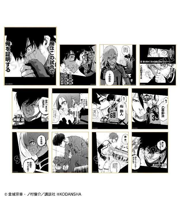 潔 世一、蜂楽 廻、千切 豹馬、凪 誠士郎、糸師 凛、御影 玲王、烏 旅人、乙夜 影汰、氷織 羊、絵心 甚八、糸師 冴、オリヴァ・愛空の作中の1シーンをミニ色紙に仕上げました。