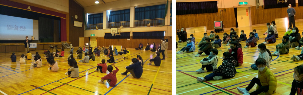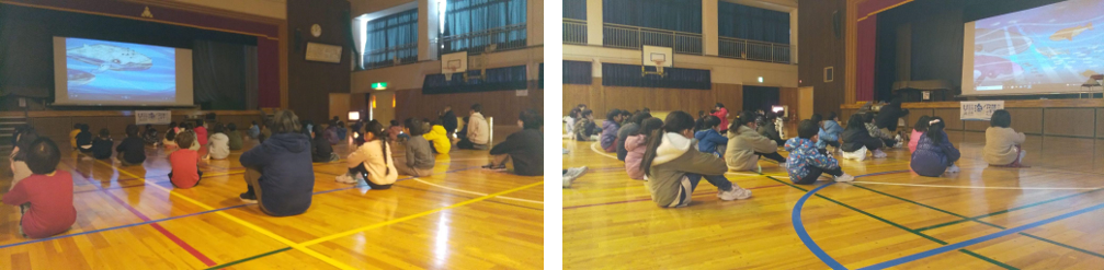 冒頭で、海ノ民話のまちプロジェクトとはどういうことをしているのか子ども達に説明をした後、「くじらの夫婦」のアニメを鑑賞しました。小海町に伝わるこの民話は、地元のボランティア団体「おはなし本舗」さんが紙芝居にして読み聞かせをしているので、知っている子ども達もいましたが、ほとんどの子どもが初めて見るということで、真剣にアニメを見ていました。