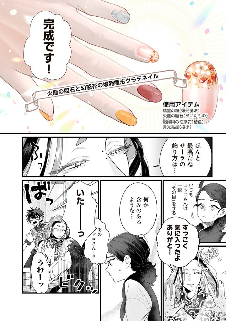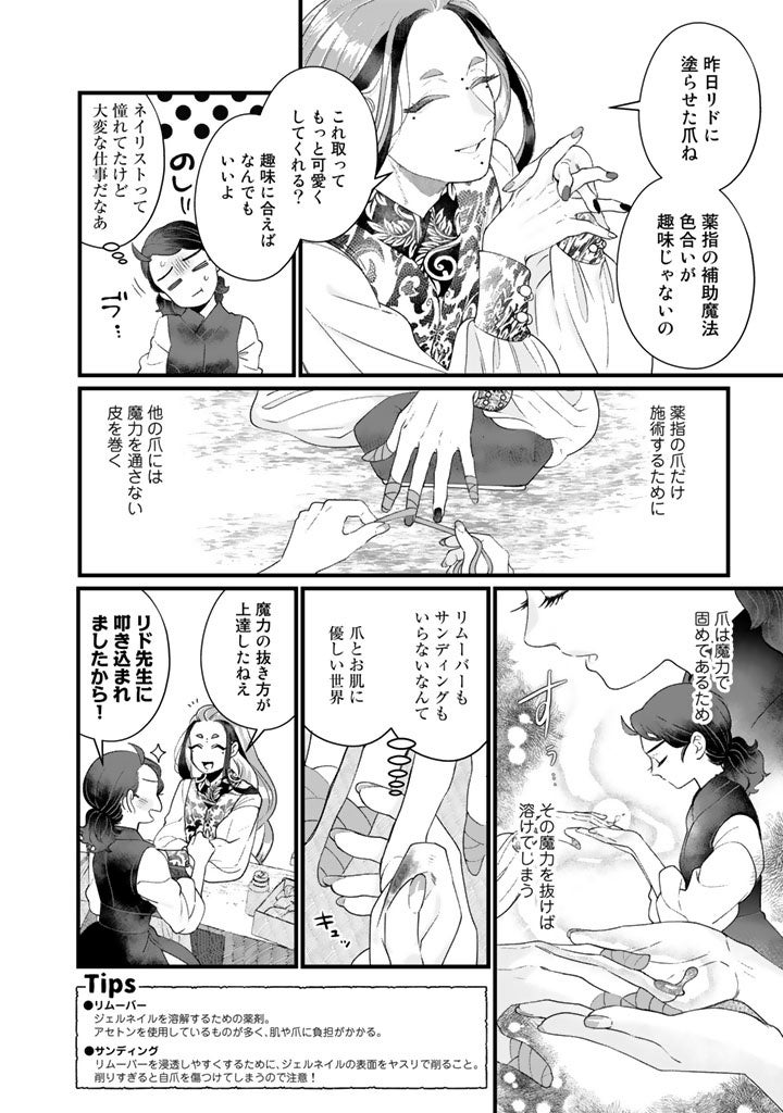 転移先は爪で魔法を使う世界!? ネイルが趣味の女子が武装を施す、異世界ネイルファンタジー。ジェルネイルが趣味の会社員・佐原啓子(サーラ)が飛ばされた先は、爪で魔法を使う世界。そこでは爪に魔法の素材をペイントする、「爪塗り」と呼ばれる者たちが活躍していた! 成り行きで爪塗り見習いになったサーラが、癖の強い最強魔法使い・ロッコ初め、魔法使いの弟子・ホオ、爪塗りの師匠・リドたちとの毎日を通して、爪塗りとして異世界を歩む、お仕事ファンタジー。
