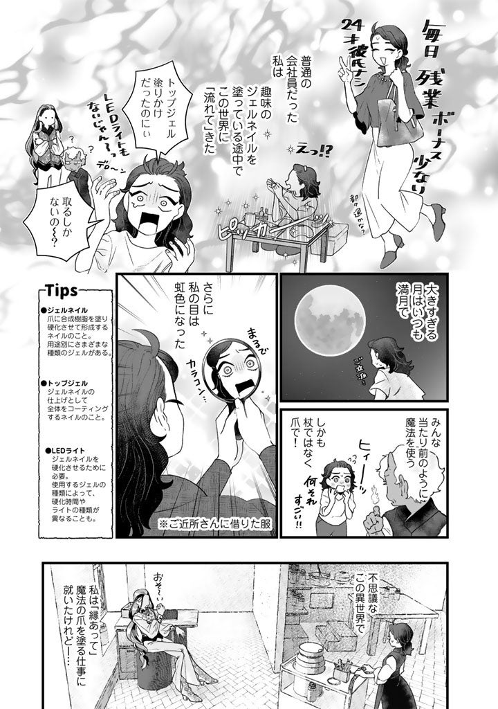 転移先は爪で魔法を使う世界!? ネイルが趣味の女子が武装を施す、異世界ネイルファンタジー。ジェルネイルが趣味の会社員・佐原啓子(サーラ)が飛ばされた先は、爪で魔法を使う世界。そこでは爪に魔法の素材をペイントする、「爪塗り」と呼ばれる者たちが活躍していた! 成り行きで爪塗り見習いになったサーラが、癖の強い最強魔法使い・ロッコ初め、魔法使いの弟子・ホオ、爪塗りの師匠・リドたちとの毎日を通して、爪塗りとして異世界を歩む、お仕事ファンタジー。