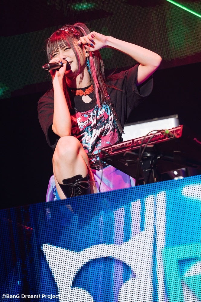 そんなラスベガスに対して、RASは、自らの限界に挑み、自分たちの殻を破るかのようなセットリストで勝負を掛けた。色とりどりのペンライトが輝くフロアに向けて、小原莉子(ロック/Gt)のギターリフが先導する「SOUL SOLDIER」で口火を切る。間髪入れずに、夏芽(マスキング/Dr)が高速ツインペダルで突っ走る「OUTSIDER RODEO」へと移行すると、“RAISE YOUR HANDS, NOW!”の掛け声を繰り返し、場をさらにヒートアップさせた「A DECLARATION OF ×××」、紡木吏佐(チュチュ/DJ)がDJプレイで魅せた「HELL! or HELL?」と立て続けにパフォーマンス。ペース配分を無視したかのような猛ラッシュで攻めていく。さらに、この日が初披露となるラスベガスの「Just Awake」のカバーをプレイ。倉知玲鳳(パレオ/Key)がエモーショナルな音色を鍵盤で奏で、紡木吏佐はラップでRASらしい味付けを施し、Raychell(レイヤ/Ba/Vo)は持ち前のパワフルなハイトーンボイスを冴え渡らせた。気づけば、ここまでMCなしでの怒濤の5曲連続パフォーマンス。相当の覚悟と気合でラスベガスとの共演に挑んでいることが伝わってくる。