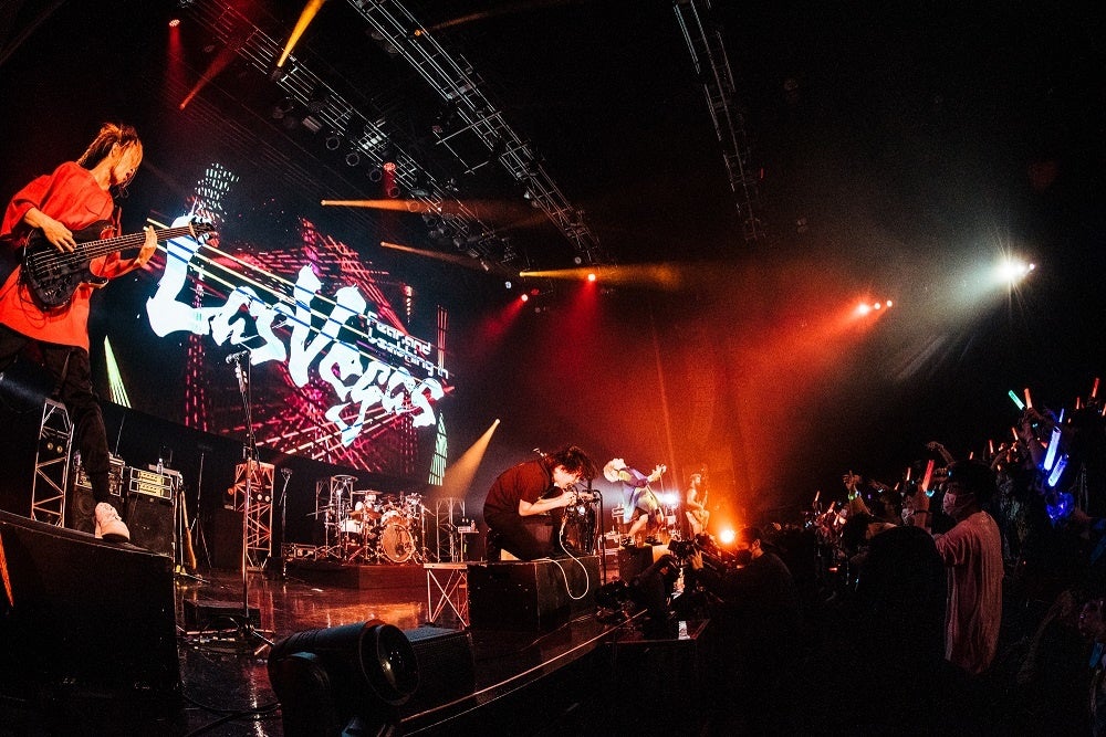 Soが“みんなから飛んでくるパワーがホンマに凄いです。流石にRASのお客さんやなって感じです。みんな、そのサイリュームを俺らのときも振ってくれたら嬉しいな。みんな、バンバン振ってくれますか?”とリクエストすると、バンドリーマーはそれに応えて、真っ赤な光の海を作り出す。普段のラスベガスのライブではなかなか見ることができない、この日ならではの光景だ。