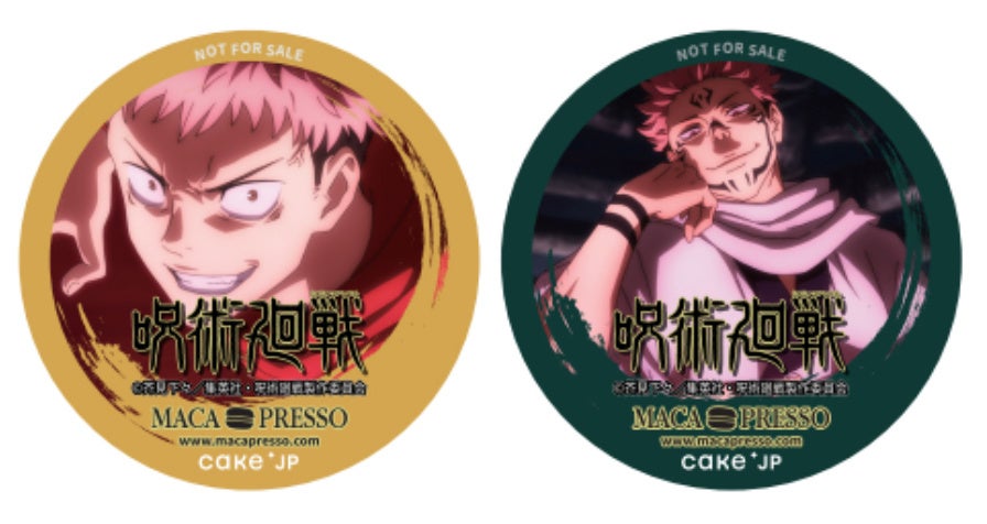 本商品はMACAPRESSO各店舗でもお買い求めいただくことができます(6個セットから)。虎杖悠仁と宿儺のイラストが描かれたノベルティをご用意しており、MACAPRESSO店頭限定で「コースター」を、それぞれ2種の中からランダムにお渡しいたします。