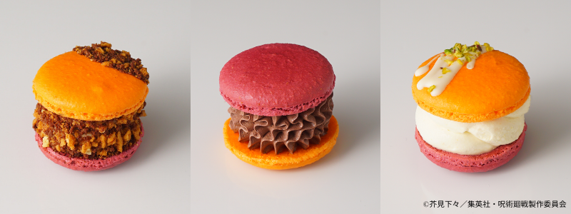 「トゥンカロン」の皮は片面をオレンジ味、もう片面をベリー味で仕上げ、虎杖悠仁と宿儺の2面性を表現しています。