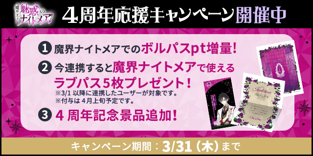 - 「VOLTAGEパスポート」にて「魔界王子と魅惑のナイトメア」4周年応援キャンペーン開催中