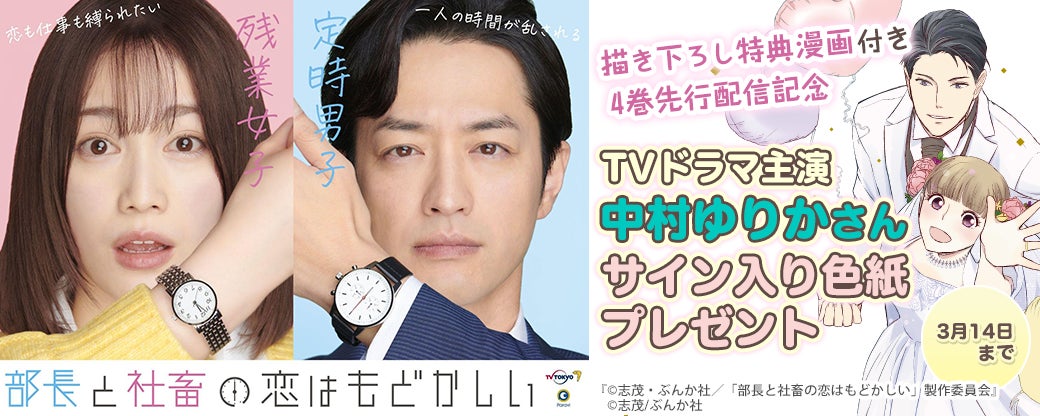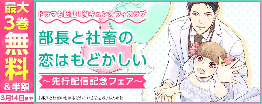 さらに、人気作品が無料増量キャンペーン中!「部長と社畜の恋はもどかしい」は単行本1巻無料となっております。この機会に漫画もTVドラマも合わせて「部長と社畜の恋はもどかしい」をお楽しみください。