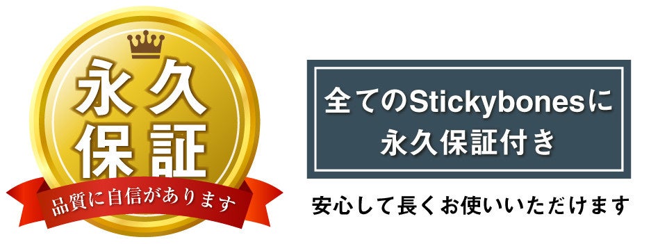 全てのStickybones には、なんと永久保証が付いてきます。通常の使用範囲による損傷については、無期限でパーツ単位での交換に応じますので、いつまでもお楽しみいただけます。(※1)