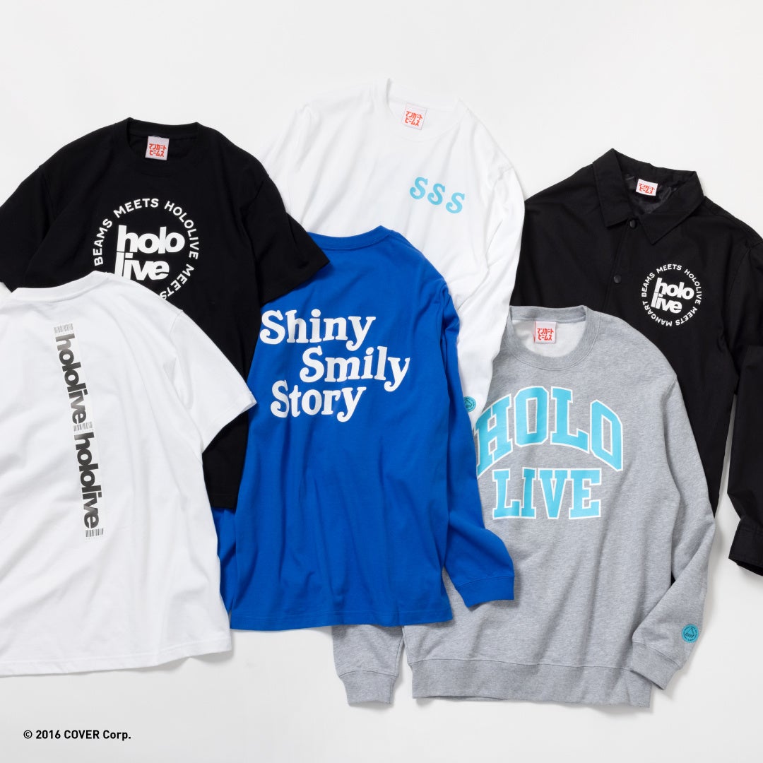 再始動第一弾企画として、VTuber事務所「ホロライブプロダクション」とのコラボレーションが実現。初の事務所全体イベントとなる《hololive SUPER EXPO 2022 Supported By ヴァイスシュヴァルツ》及び《hololive 3rd fes. Link Your Wish Supported By ヴァイスシュヴァルツ》のオフィシャルグッズ4型を製作しました。いつも応援して頂いているファンの皆様に喜んでもらえるよう製作したTシャツやロングスリーブTシャツ、コーチジャケット、クルーネックスウェットをラインナップ。“hololive.”の文字をカレッジスウェット風にしたデザインや、ホロライブ公式曲第1弾、『shiny smily story 』の文字をポップに起こしたデザインなど、日々のコーディネートに馴染むように意識した点がポイントです。本作は、イベント会場での販売などで販売する予定です。(https://shop.hololivepro.com/)購入における詳細は、後日イベント特設サイトでアナウンスされる予定です。 (https://hololivesuperexpo.hololivepro.com/goods/) ※BEAMSでの販売予定はございません。