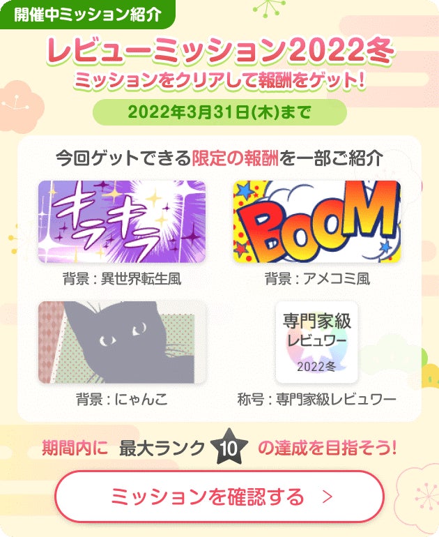 電子書籍販売サイト「ebookjapan」をヤフー株式会社と協力して運営する、株式会社イーブックイニシアティブジャパン(本社:東京都千代田区、代表取締役社長:高橋将峰(たかはしまさみね))は、2月22日(火)から3月31日(日)までレビューに関するミッションをクリアすることで「称号」や「背景」などの報酬を受け取ることができるイベントを開催しております。この機会にぜひ様々なミッションをお楽しみください。