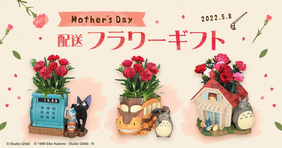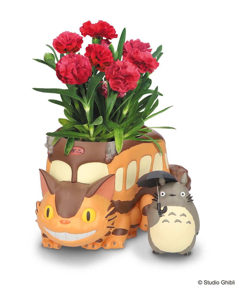 日本全国へのお届けが可能な(一部離島を除く)配送専用のフラワーギフトは、トトロやネコバス、ジジの愛らしいプランターと、着荷してからも花をつけ続けるカーネーションがセットとなり、なかなか会えない遠方の大切な方への贈り物にぴったりです。もちろん、サプライズいっぱいのうれしいギフトとしてお近くの大切な方にお贈りするのもおすすめです。